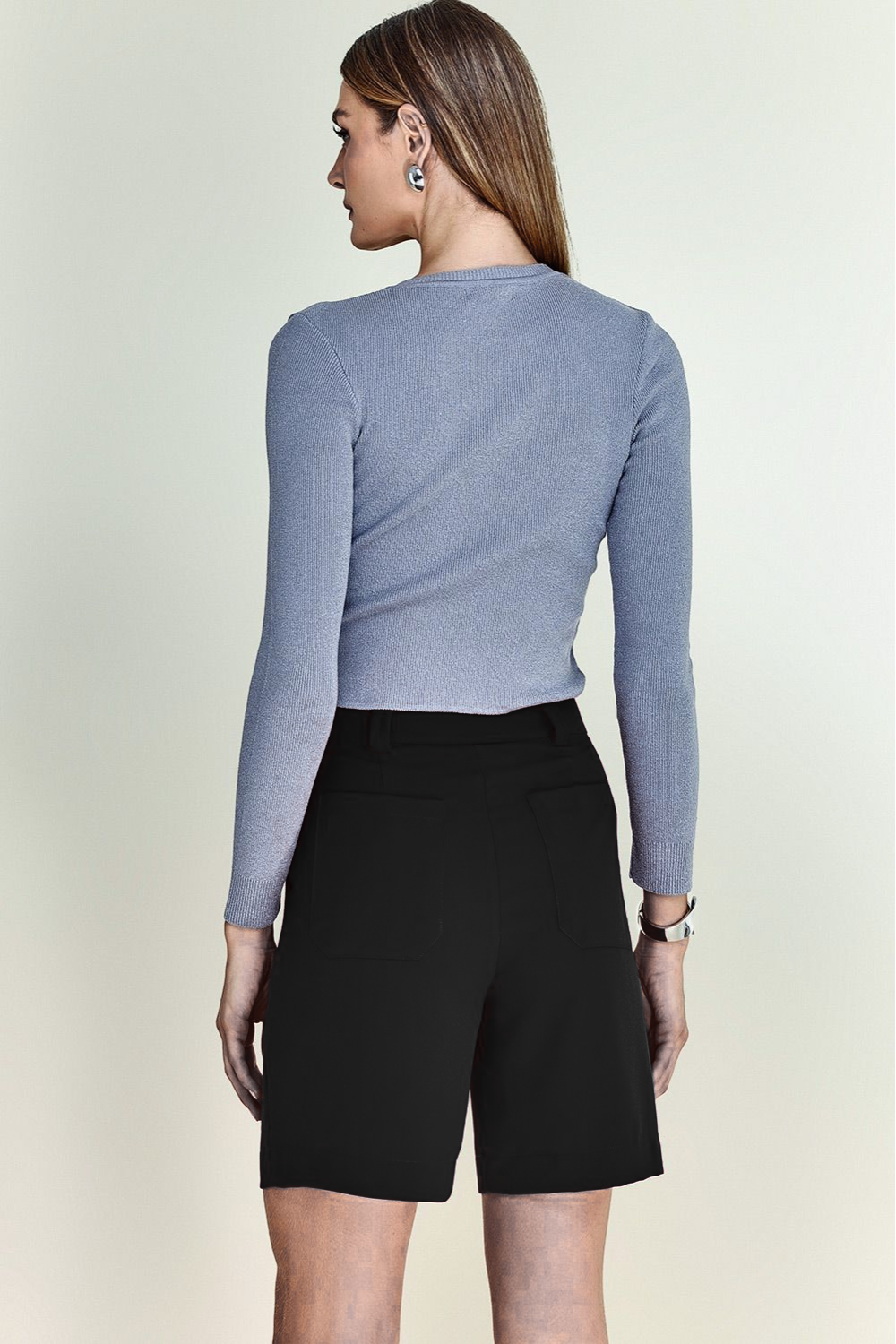 Bermuda Natasha tem comprimento á cima do joelho com corte de alfaiataria, fechamento frontal, bolso faca e e bolso traseiro.