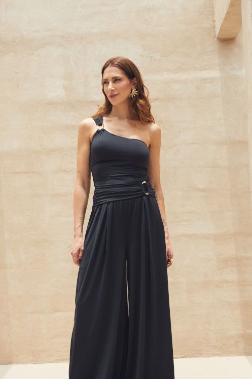 Blusa Teodora, feita em tricoline, tem modelagem slim, alças removíveis, detalhe de peplum assimétrico, fechamento por zíper invisível lateral.