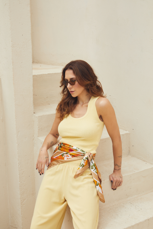 Calça Sofie feita em tecido plano com composição de fios naturais, tem modelagem cenoura, cós com passantes, possui cinto faixa com fivela de metal dourado, bolsos funcionais, fechamento lateral por zíper de metal, barra com elástico e acabamento pespontado.