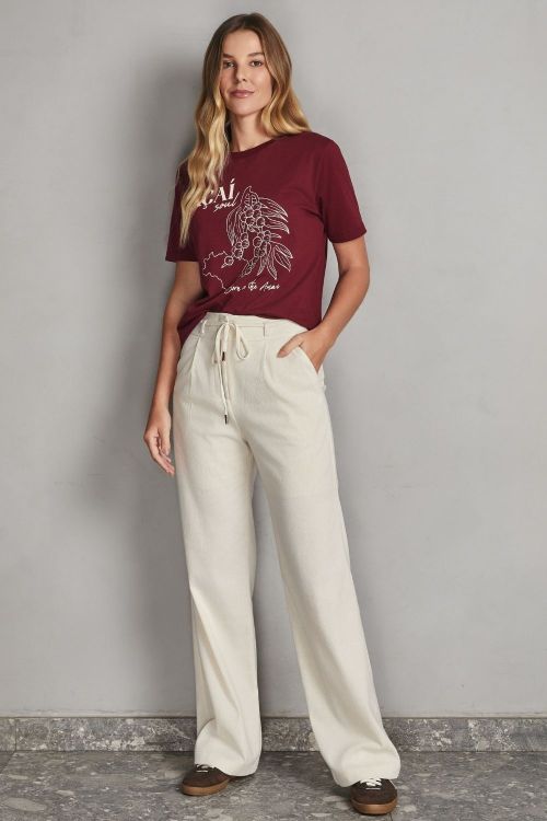A blusa transpassada conta com decote em V, mangas longas com punho ajustado e amarração na cintura, permitindo ajuste personalizado e valorizando a silhueta. A calça de modelagem reta possui caimento solto, garantindo conforto e praticidade.