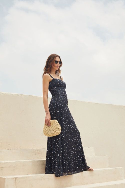 1. slow style, roupas, roupa feminina, vestidos, vestido elis longo estampado, vestido poá azul marinho , vestido leve feminino, vestido verão elegante, vestido fluido Slow.