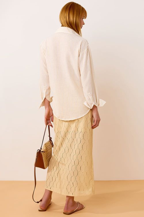 1. slow style, roupas, roupa feminina, camisa duda listrada feminina, camisa manga longa amarela, camisa viscose leve, camisa casual chic, camisa feminina elegante.