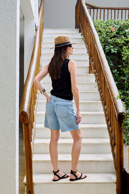 Shorts Aurora confeccionado em tecido plano com corte de alfaiataria, padronagem risca de giz, possui detalhe no cós com martingale e botões, bolso faca, fechamento frontal por gancho e zíper.